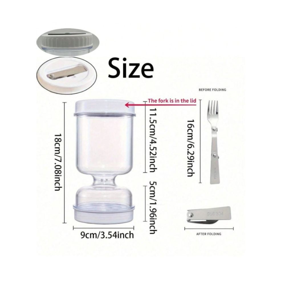 Hecho de material de grado alimenticio, sin olor químico; bonito diseño de tarro transparente, se puede ver claramente el interior. Incluye tenedor plegable en la tapa. Es fácilmente almacenable en la nevera.