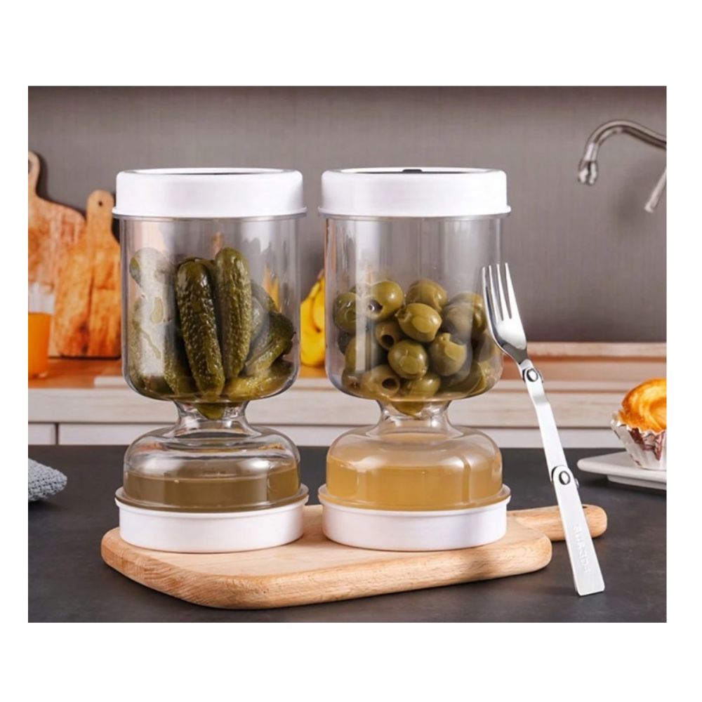 Tarro de reloj de arena para aceitunas y pepinillos, separador de líquido, contenedor de alimentos con colador, tapa hermética de rosca con tenedor plegable. Hecho de material de grado alimenticio, sin olor químico; bonito diseño de tarro transparente, se puede ver claramente el interior.